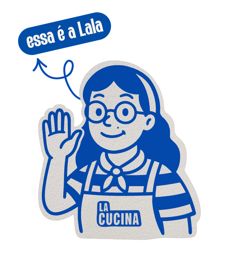 Nossa paleta traz as cores em aquarela que são base de tantas bandeiras ao redor do mundo: verde, amarelo, azul e vermelho. Porque, apesar de a cozinha italiana ser nossa base hoje, a La Cucina é como um laboratório criativo culinário para nós — que um dia terá um espaço físico — onde temos a liberdade de aprender, experimentar e testar receitas do mundo todo.
